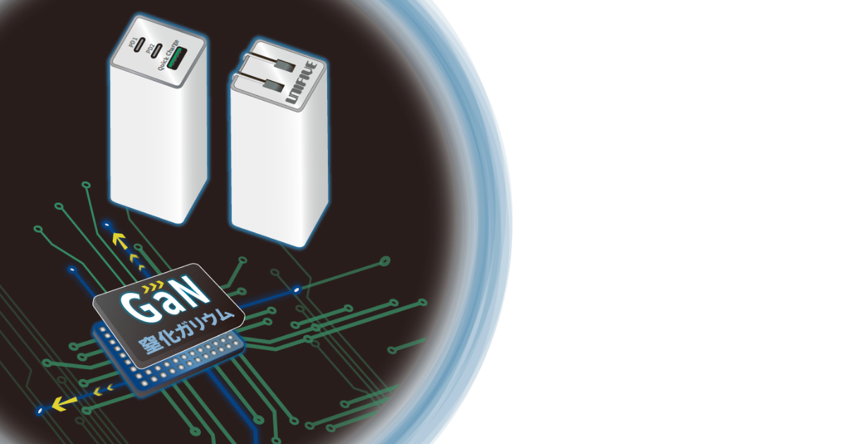 Diese Seite erklärt AC-Adapter und Schaltnetzteile, die mit GaN (Galliumnitrid)-ICs ausgestattet sind, welche als Halbleiter der nächsten Generation gelten. Diese Technologie wird in dem von Unifive entwickelten USB-PD-Adapter verwendet.