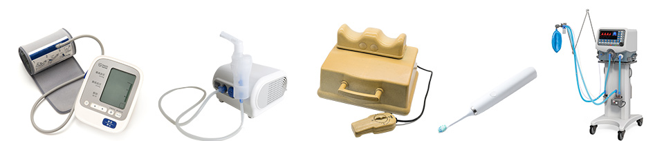 例:血圧計、噴射機/ネブライザー、鼻洗浄機、痰吸引器、マッサージ機、電動歯ブラシ、酸素発生器 …等