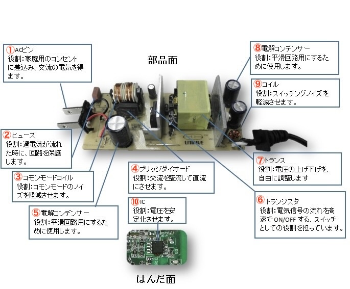 Estamos explicando de forma fácil o funcionamento do adaptador AC. A explicação começa pelo circuito e também apresentamos os nomes das peças com ilustrações, por isso esperamos que seja útil como referência.